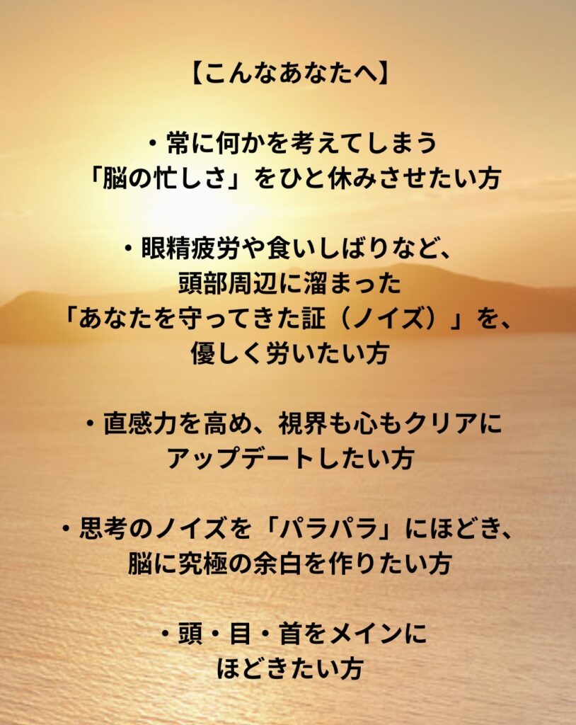 関節・筋肉・神経の強張りをパラパラにほどき、脳が本来のパフォーマンスを発揮できる状態へとアップデートする優しいタッチ。