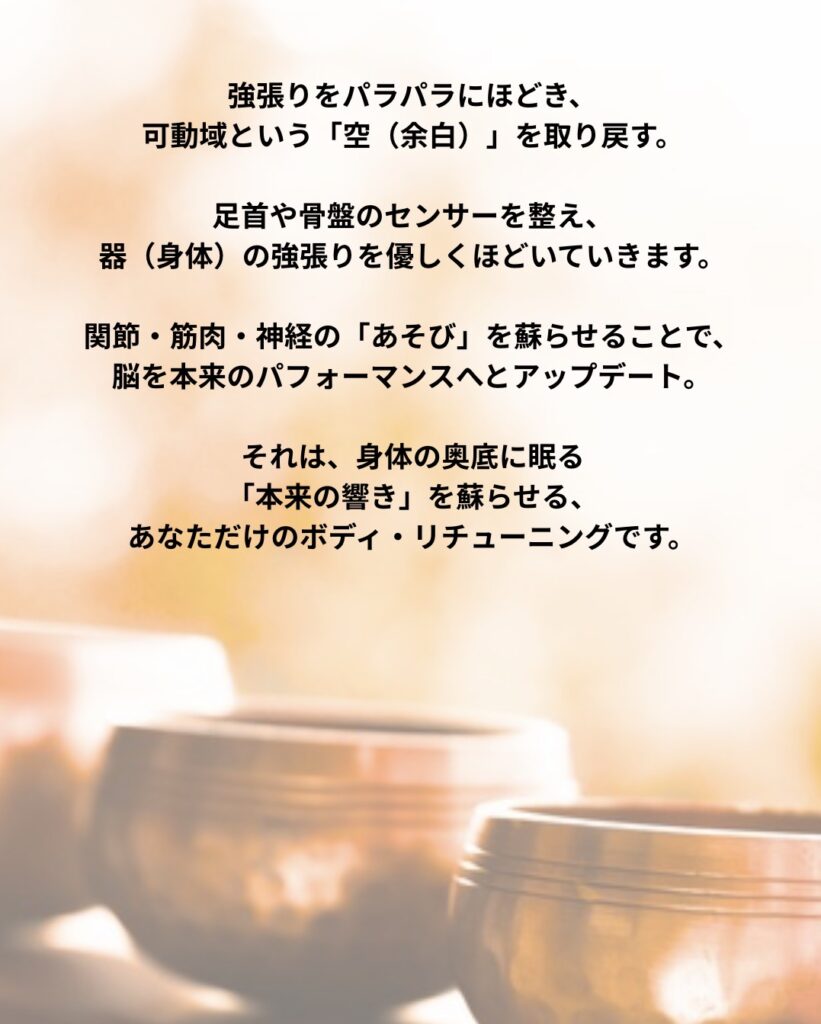 固まっていた筋肉はパラパラとほどけ、内側に美しい「余白(あそび)(余裕)」が生まれます。